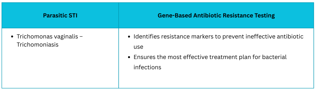 Our PCR-based molecular STI testing panel screens for bacterial, viral, and parasitic STIs, along with antibiotic resistance markers to ensure effective treatment.